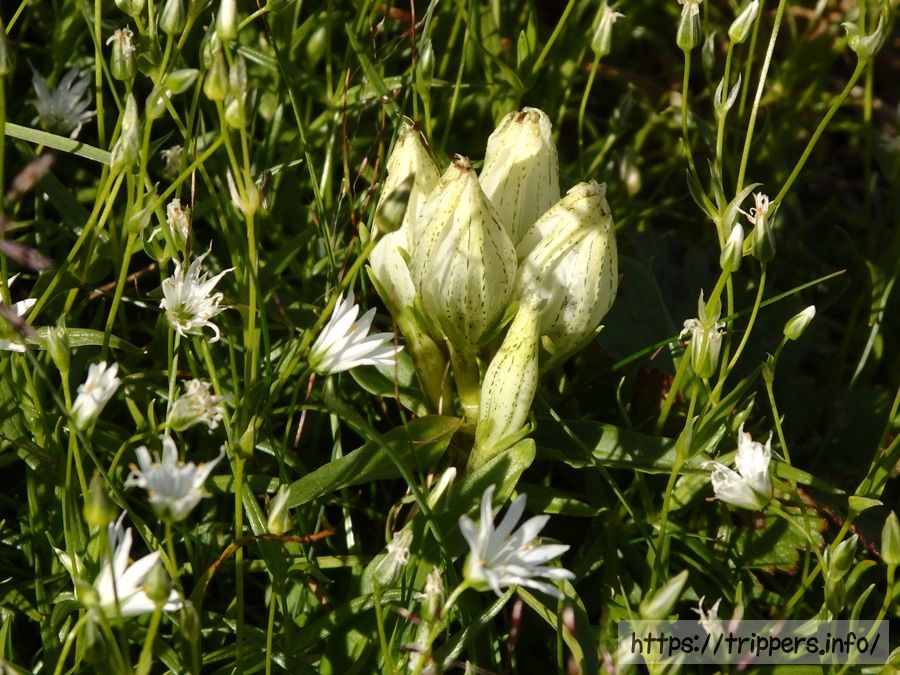白いイワツメクサのお花畑の中にエイリアンの卵ならぬ、トウヤクリンドウを見つけました。なんか我が物顔で主役を演じているように見えます。