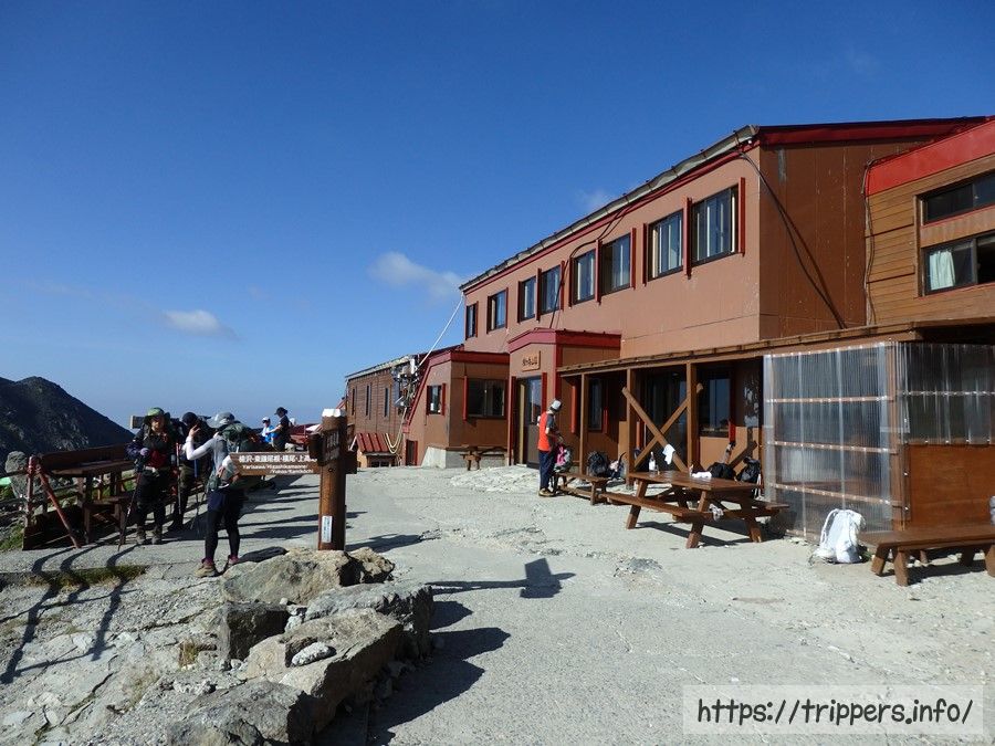 ゆっくりペースで進みながら無事に山荘まで辿り着くことができました。子槍を見てみると、なんと登っている人がいました。いつか登ってみたいけれど、絶対に登ってみたくない場所。ジェットコースターも乗ってみたいけれど絶対乗りたくないので、絶対に子槍へは行けなさそうです。
