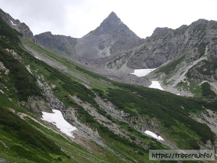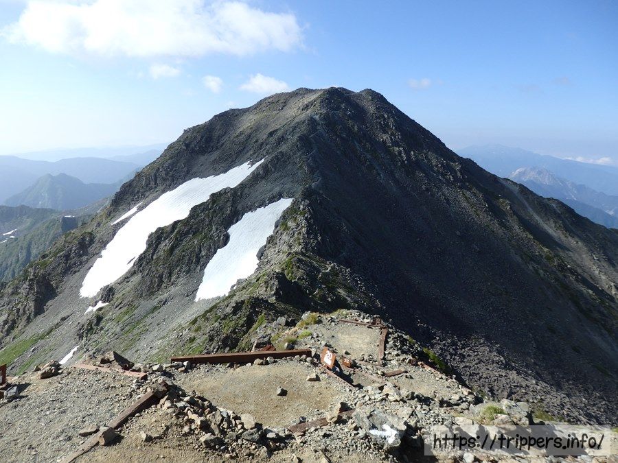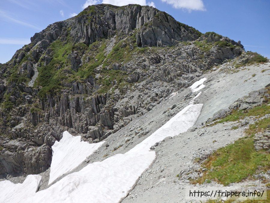 昨日一杯だったテントは既に空き地になっています。目の前に見えるのが標高3,101mの大喰岳です。「おおくいだけ」って読むのかと思いきや、正しくは「おおばみだけ」と読みます。知らないと読めない。(笑)