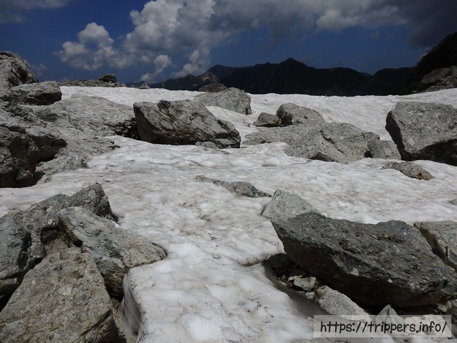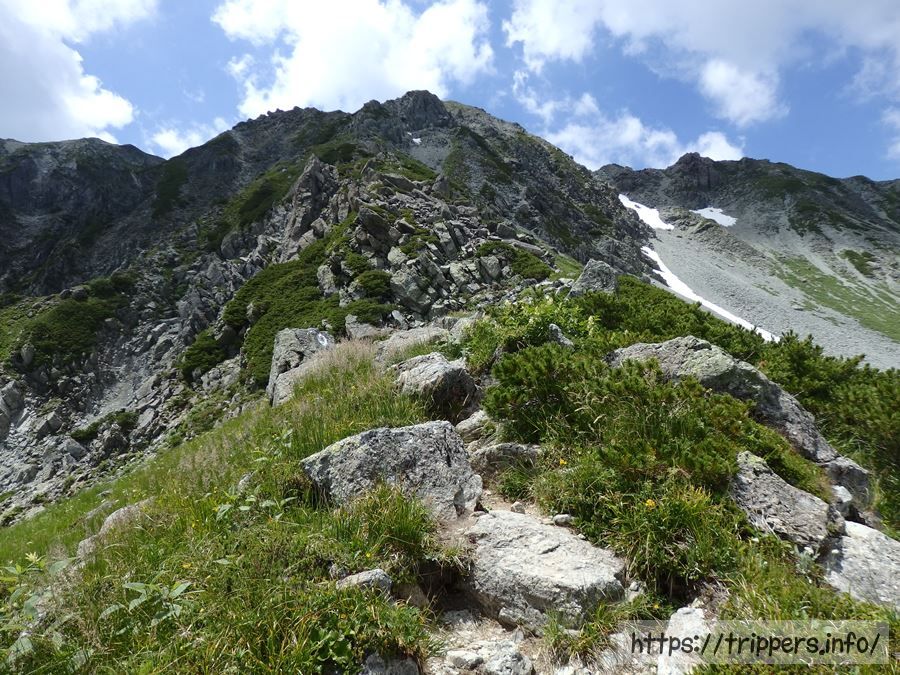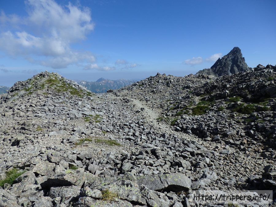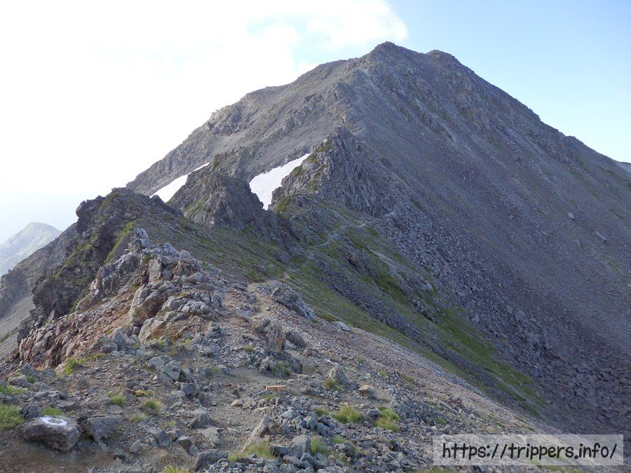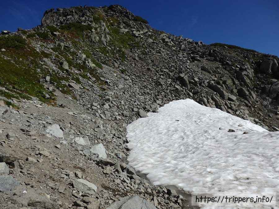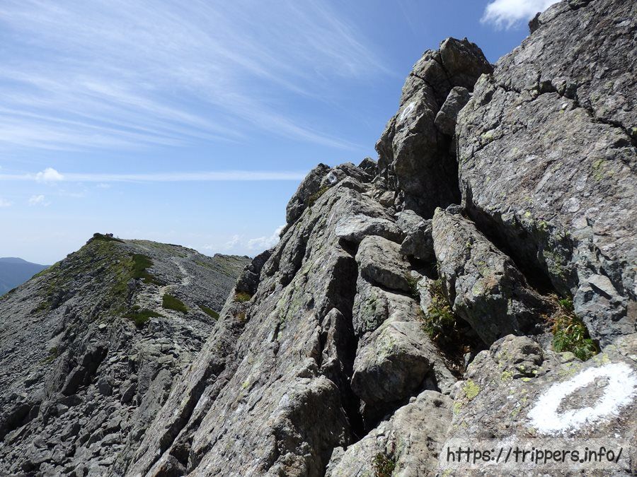 ここからガレ場や岩場を降りて行き、なだらかな稜線歩きです。ここら辺に今だけ出現する水場があるそうですが、見つけられませんでした。