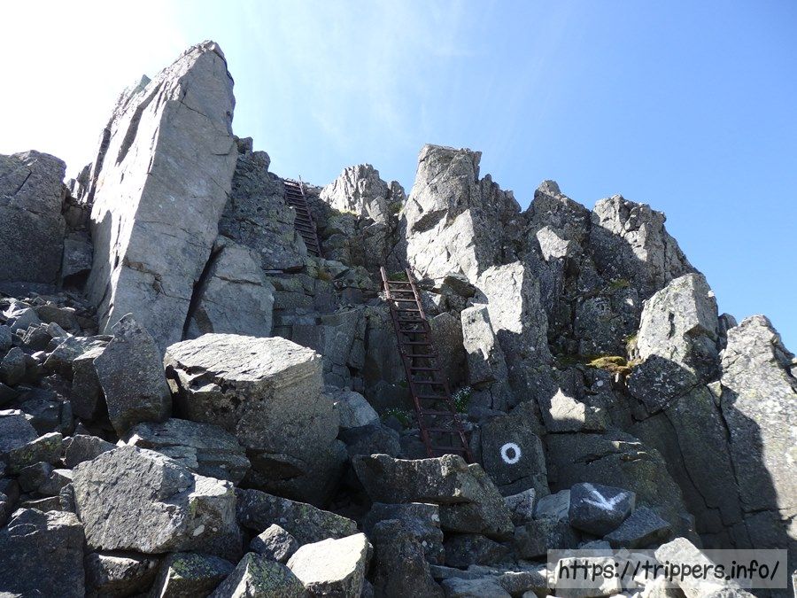 登りで一番怖かった場所がここです。このハシゴを登ったら、どこに手を伸ばし、どこに足を置けばよいのか疑問に思ったら、私と同じ岩場初心者です。小さな輪っかと岩から突き出た釘の様な太い棒が、手でつかんだり、かつ足を置く場所になってました。
