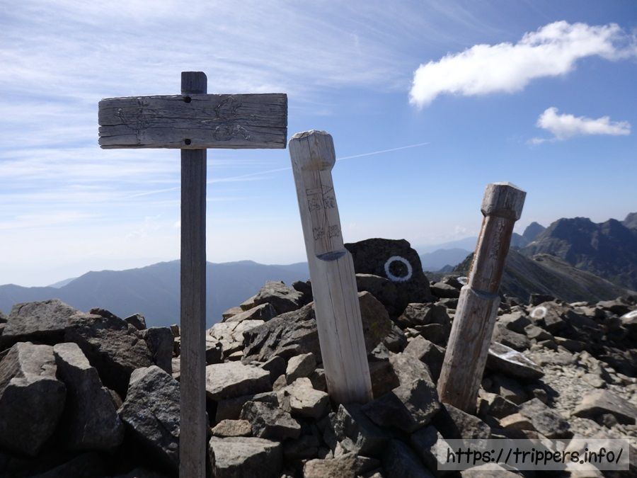 標高3,084mの中岳に到着。特に言う事はないです。稜線の一部って感じです。看板の文字のインクが全て剥がれています。