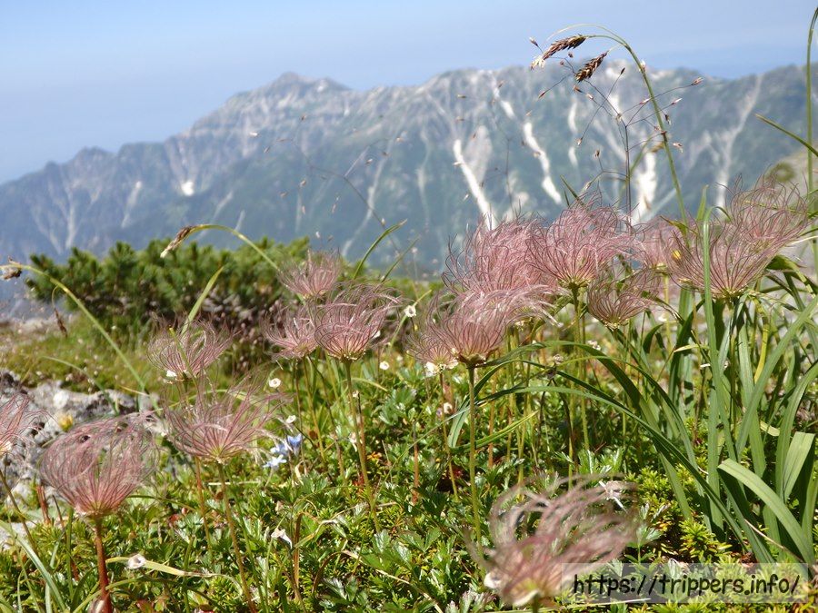 中岳と南岳の間の稜線にてチングルマと笠ヶ岳。標高が高いとどの植物も背丈が低いな~ってこういうアングルの写真を撮る度に思います。