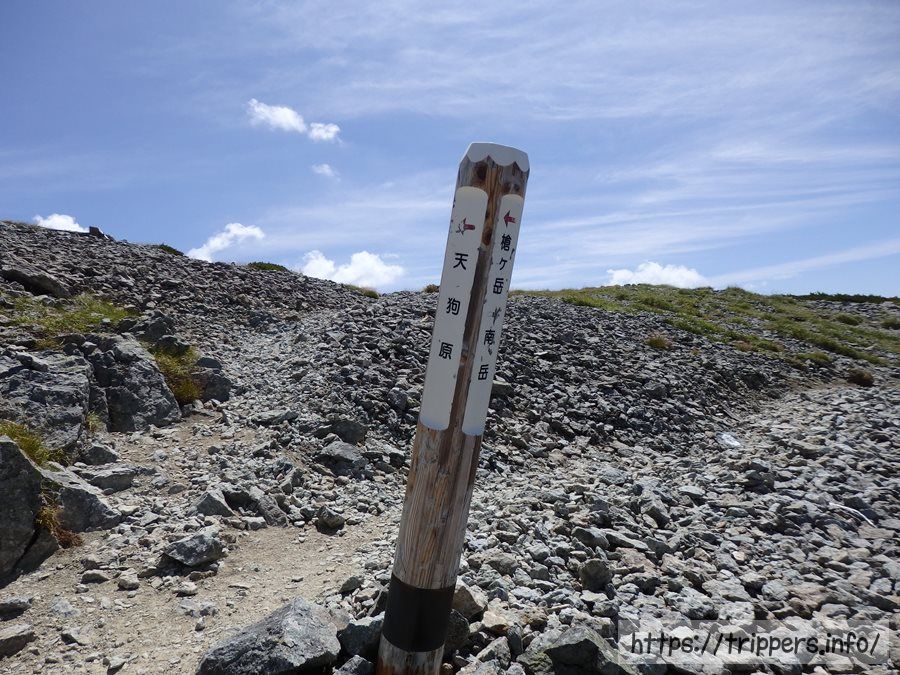 天狗原稜線分岐に到着しました。ここから南岳→南岳小屋まで行ったら、ここまで戻って来て、天狗池の方へ下って行きます。