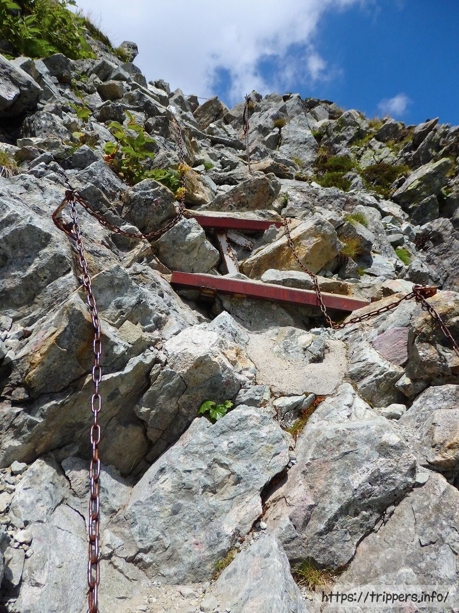 嫌な予感は的中でした。ぱっと見垂直のような場所に、壊れたようなブランコのような鎖場。登りだったら恐怖を感じなかっただろうけれど、下りだったので、愚痴がでました。