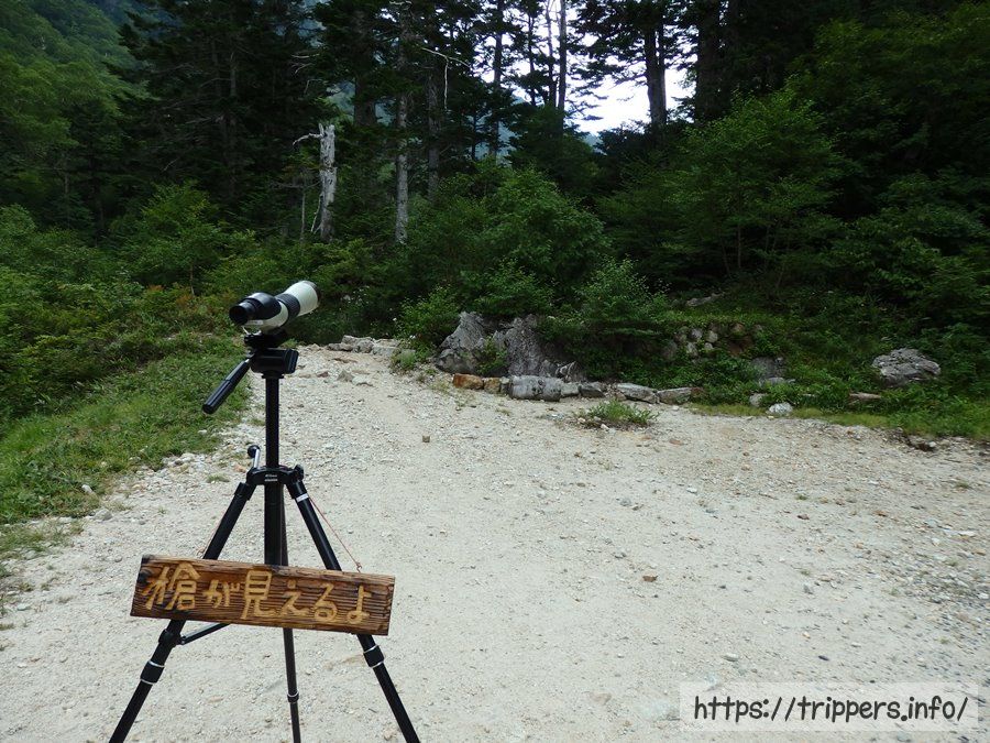 行きには置いてなかった望遠鏡を発見。覗き込んでみると槍ヶ岳の穂先が見えました。しかも頂上に人がいるのが見えます。