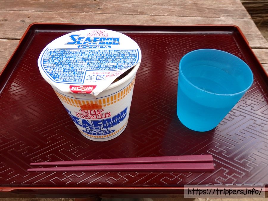 昼食の提供時間が14:30までで、間に合いませんでした。なので400円のカップラーメンでお腹を満たします。以前山でラーメンを食べてた人の話では、山で食べるラーメンは塩が一番美味しいといってました。確かに美味しい。