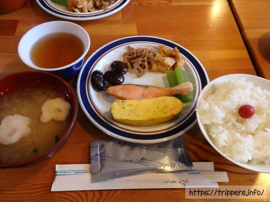 翌朝の天気は相変わらずガスっており、強風でしたが雨はほぼ止んでいました。別館から本館に移動し、朝食です。やっぱりご飯が美味しくなかったです。