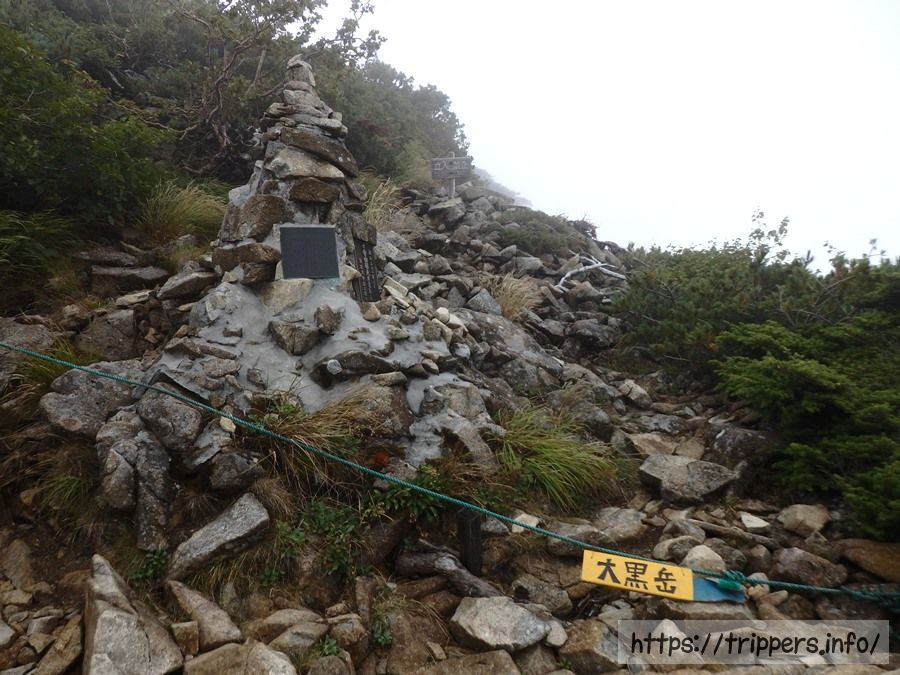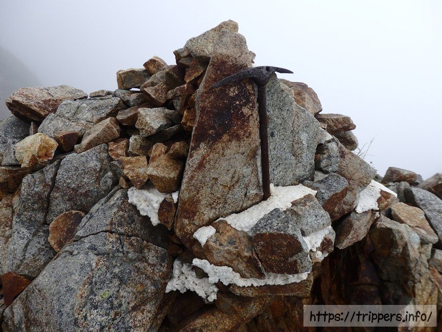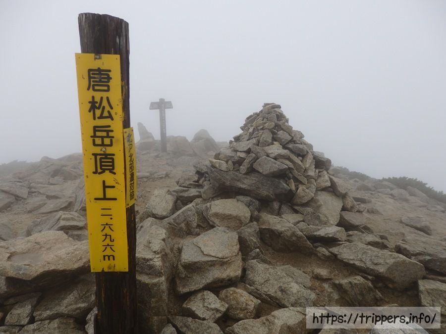 唐松岳頂上(2,696m)に到着しました。昨日も今日も視界は最悪で、明日の天気予報も雷の可能性まであるので展望は絶望的です。