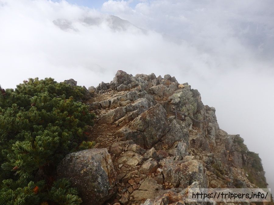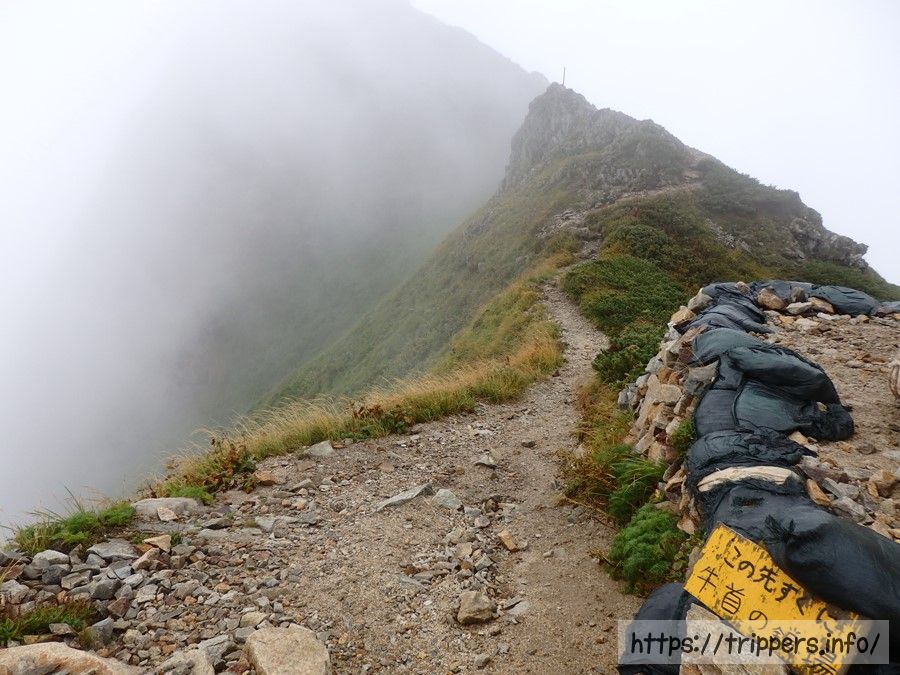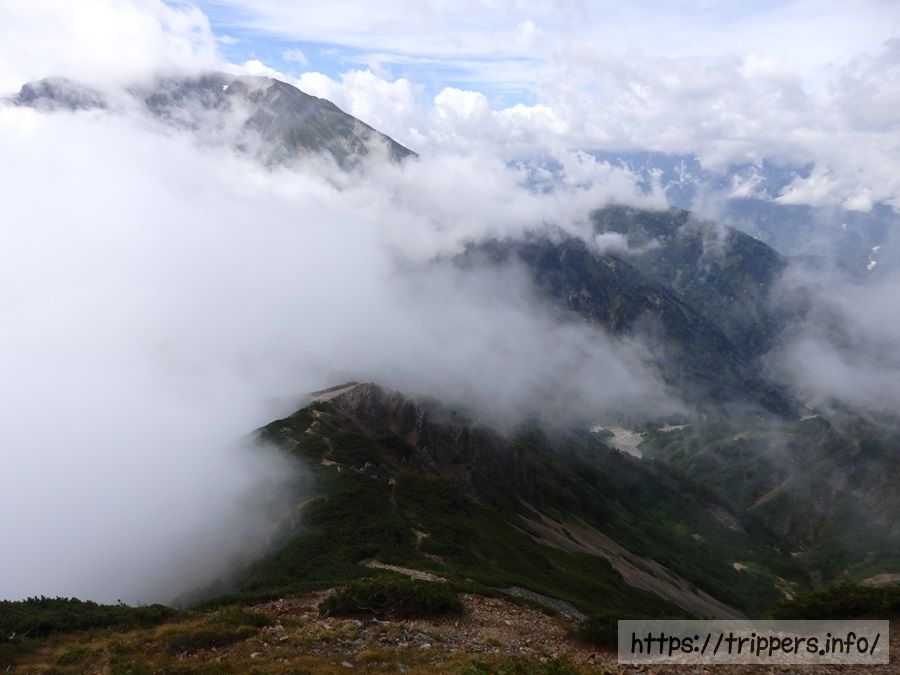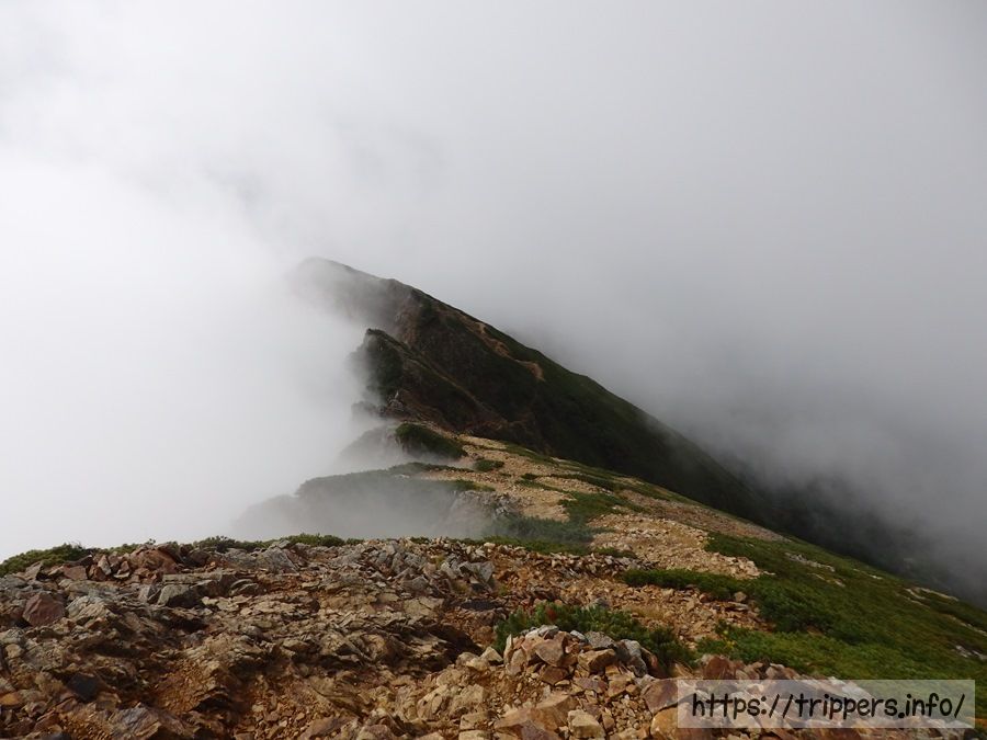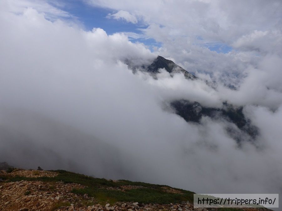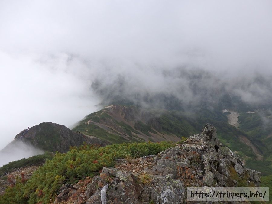 雲の切れ間に見えるのが五竜岳です。初めて通るルートなので、ガスでルートが見えないとどんな感じで進むのか不明でした。アップダウンがどれ位あるのか、牛首がどこまで続いているのか、気になる所です。