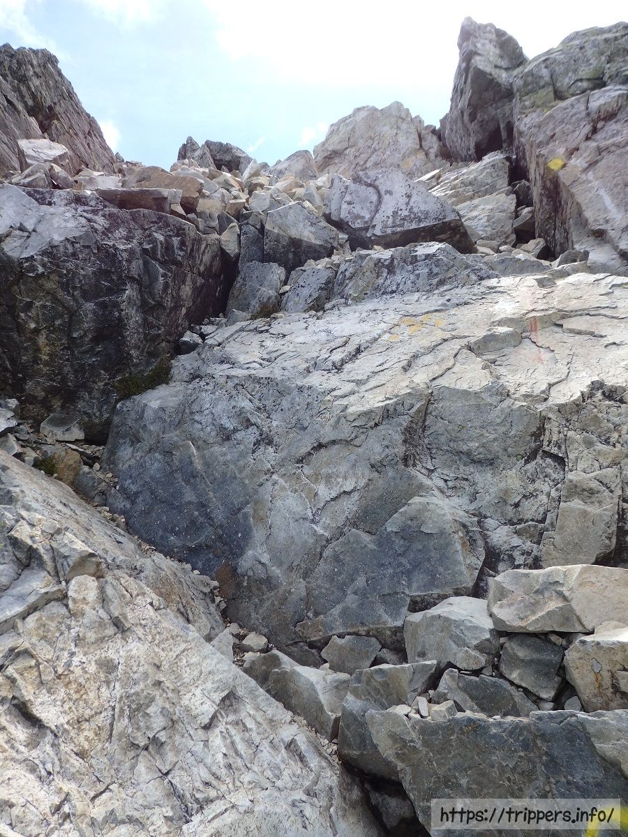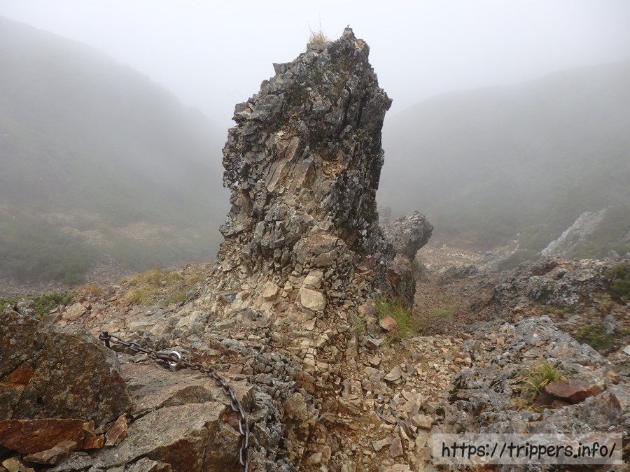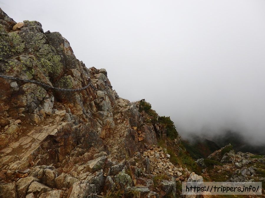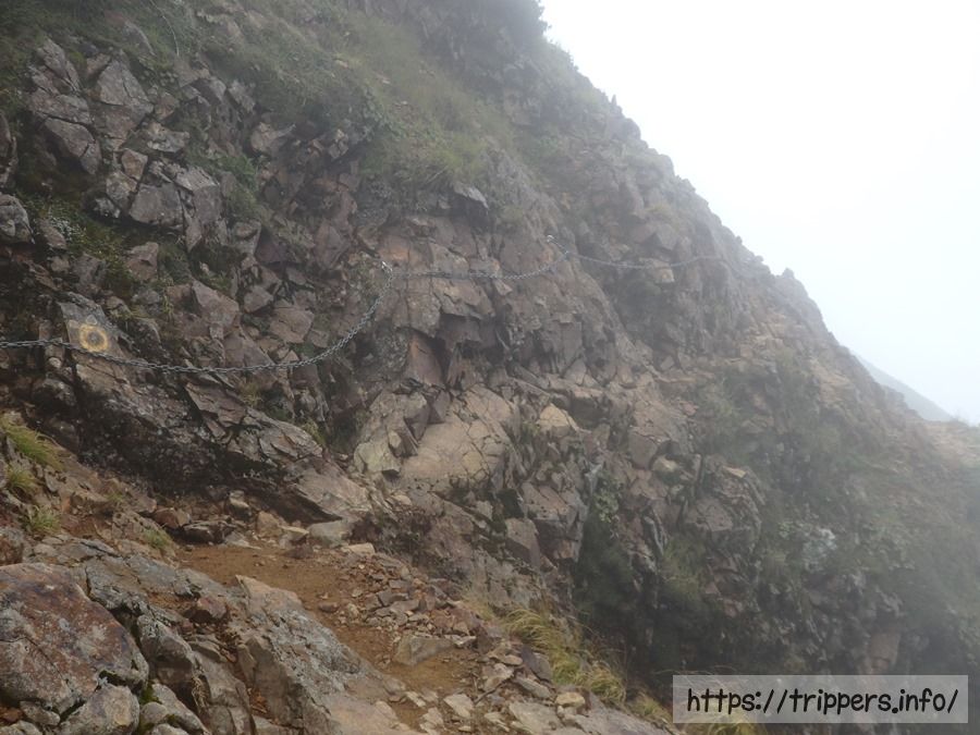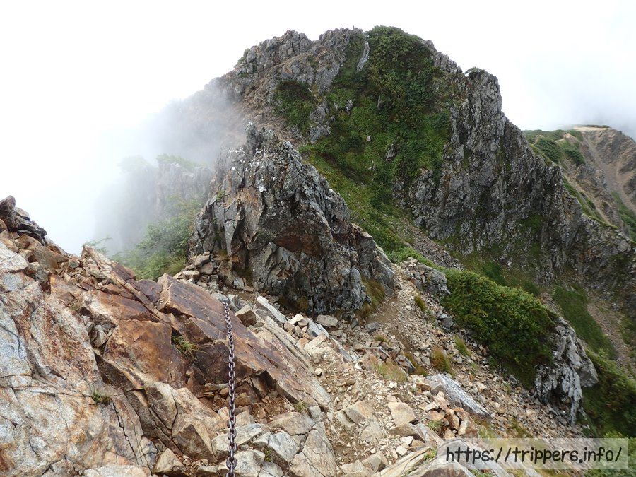 ギザギザした山の姿を見ているだけで恍惚してしまいます。遠くを見ると鎖場が待ち構えていました。