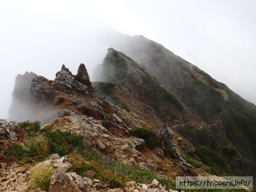 手前の稜線だけガスがなくなりました。どうやら難所は全て終わったようです。左下の岩山を見ると何か人らしいものが見えました。