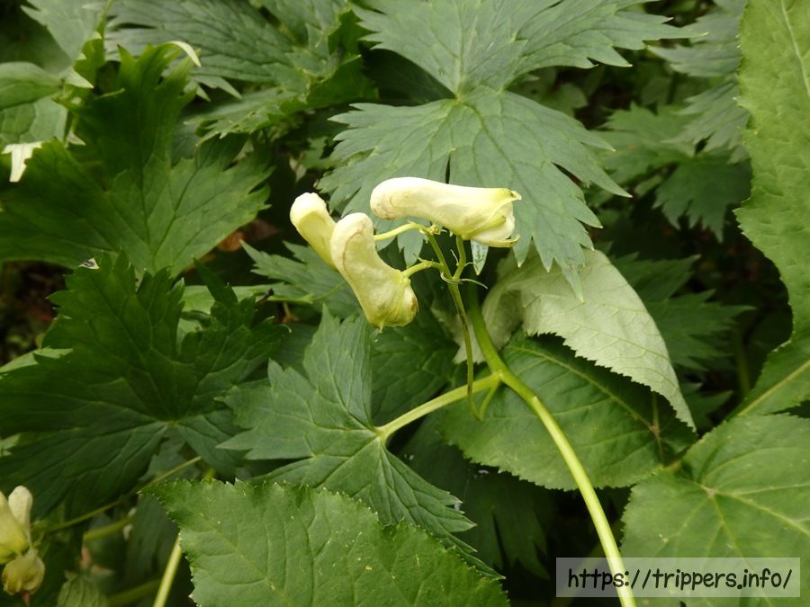 小さな水たまりの側に白いトリカブトが咲いており、初めて見ました。水たまりの中にはオタマジャクシが泳いでいました。