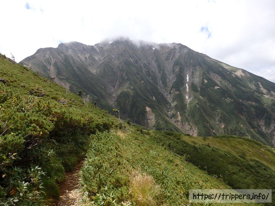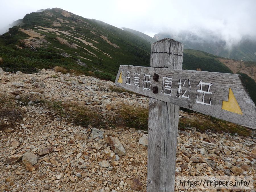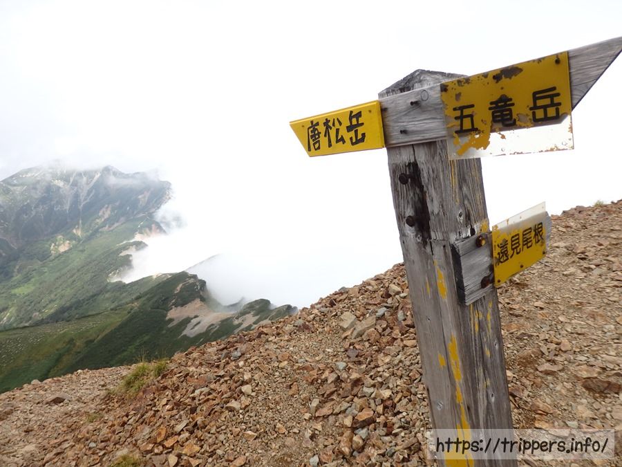 遠見尾根への分岐がありました。明日の下山はこの尾根を通ります。再び唐松岳がガスってきました。