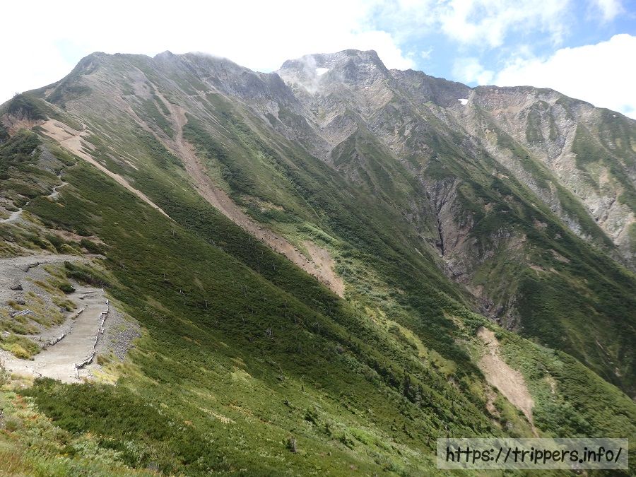 山頂手前からは鹿島槍ヶ岳とそこに続くキレットが一望出来ます。右奥には槍ヶ岳もうっすら見えました。