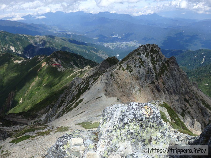遠くに白馬の町が見えます。五竜山荘から結構な高さに来ました。途中高度を感じる岩場もありました。