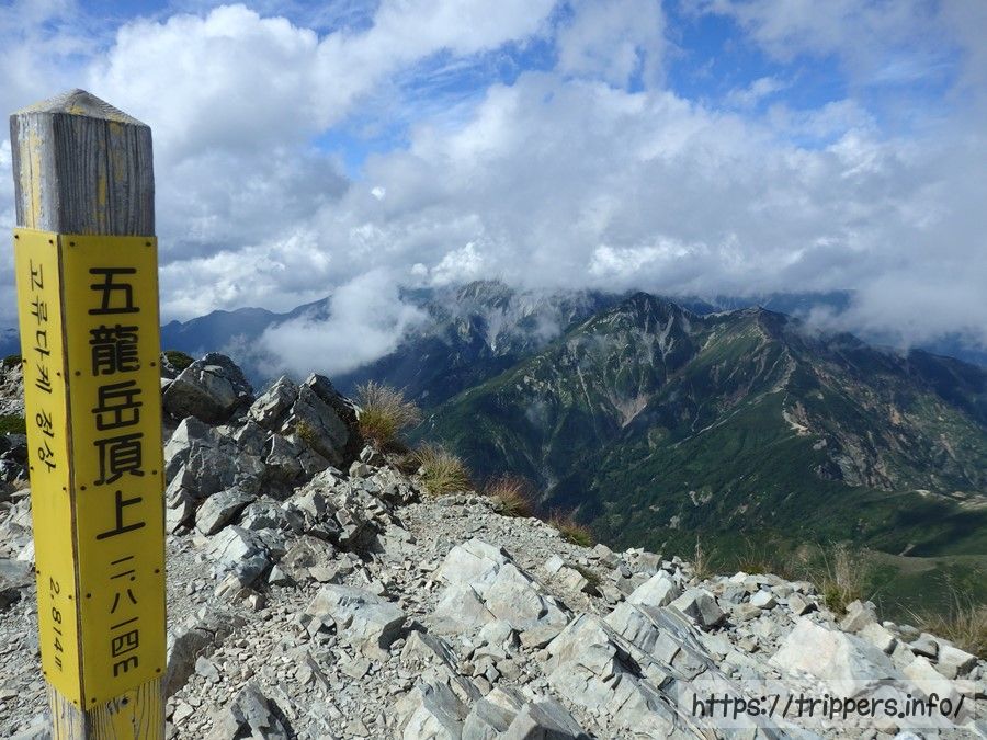 何とかガスで視界がなくなる前に五竜岳の頂上(2,814m)へ到着しました。唐松岳より標高が高いのが良く分かります。360℃の大展望は山頂に到着した特典でした。