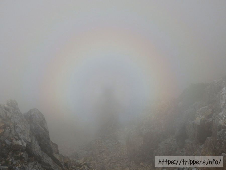 ガスの影響で雨になるまでの少しの間、ブロッケン現象が発生しました。