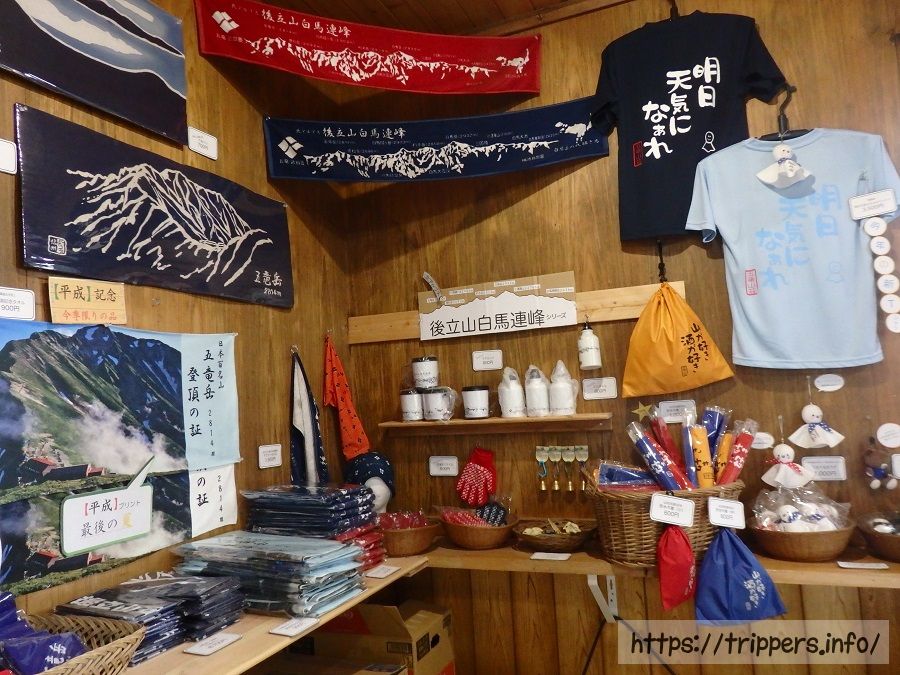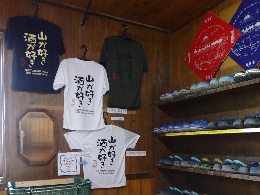 山荘では色々な商品が販売しており、「山が好き、酒が好き」Tシャツを着た熊やテルテル坊主のマスコットが付いたキーホルダーがとっても可愛かったです。たまに登山リュックに小さなマスコットが着いているのを見かけるので、山に登った事をさりげなくアピールできるのではないでしょうか。登山バッジだと着けてる人を見かけないので、着けようか迷ってしまいます。