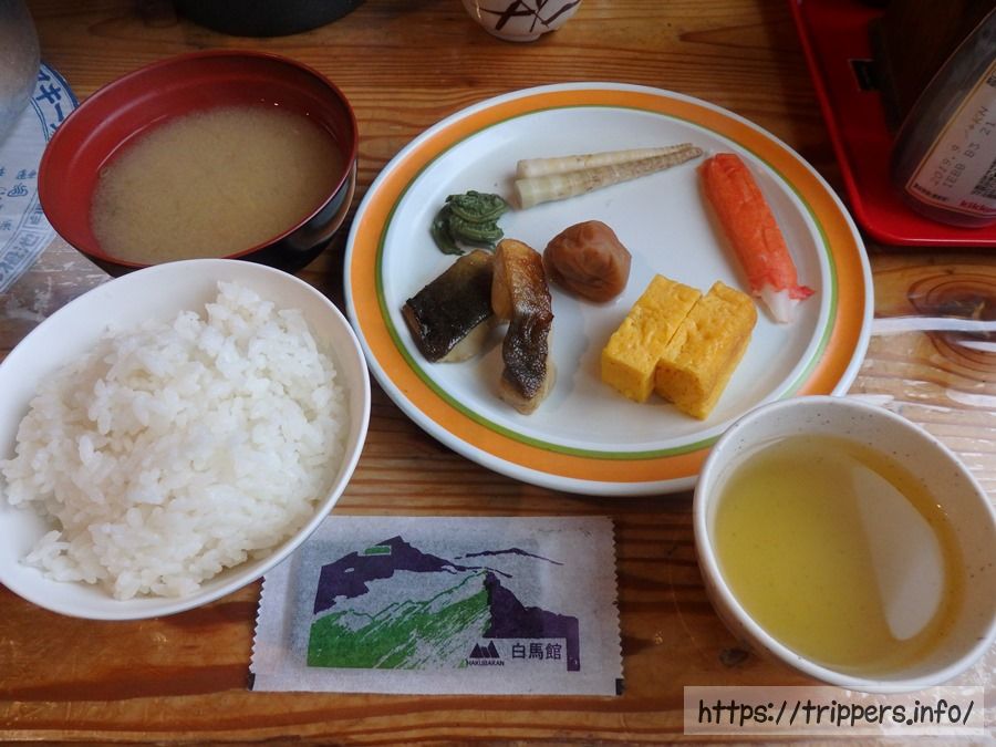 朝食は山小屋定番の和食です。5時から7時までが食事時間なので、遅め?の5時半に行きました。食事中だったのは1組だけで、他は食事を終えていなくなってました。
