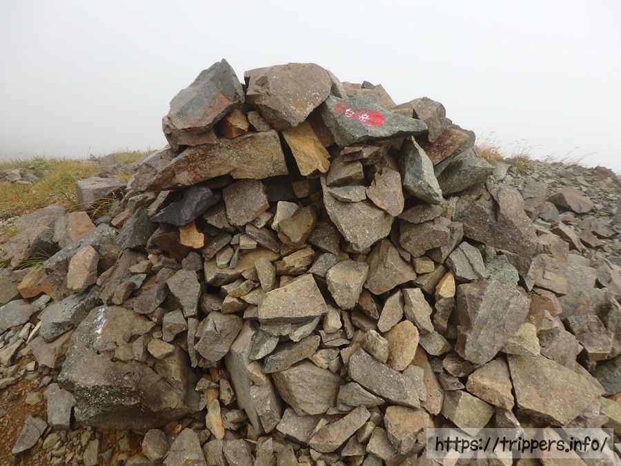 稜線上に石が積んであるだけの白岳に到着です。名前が書いてなければ、山って気が付かない場所でした。