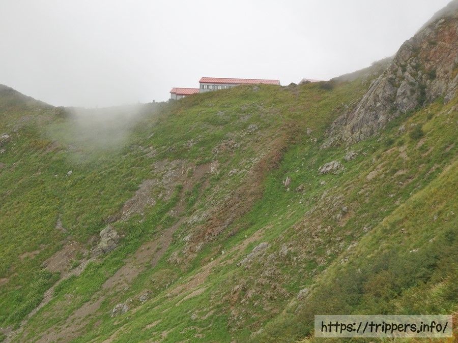 五竜山荘に別れを告げます。すぐにガスで見えなくなりました。もしかしたら雷鳥やホシガラスいないか植物観賞しながら探しましたが、結果的に本日何も出逢えませんでした。