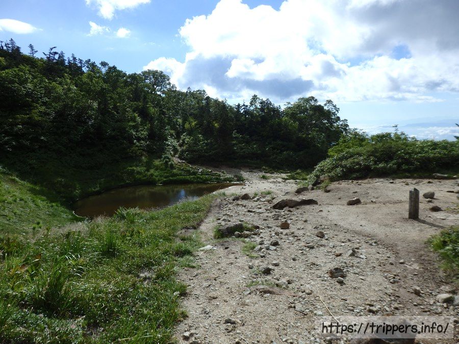 西遠見ノ池に到着です。山荘からここまで来るのに既に1時間半掛かっています。ただ、ここまで来れば鎖が設置された滑る岩場はもうないため、ペースアップが図れそうです。