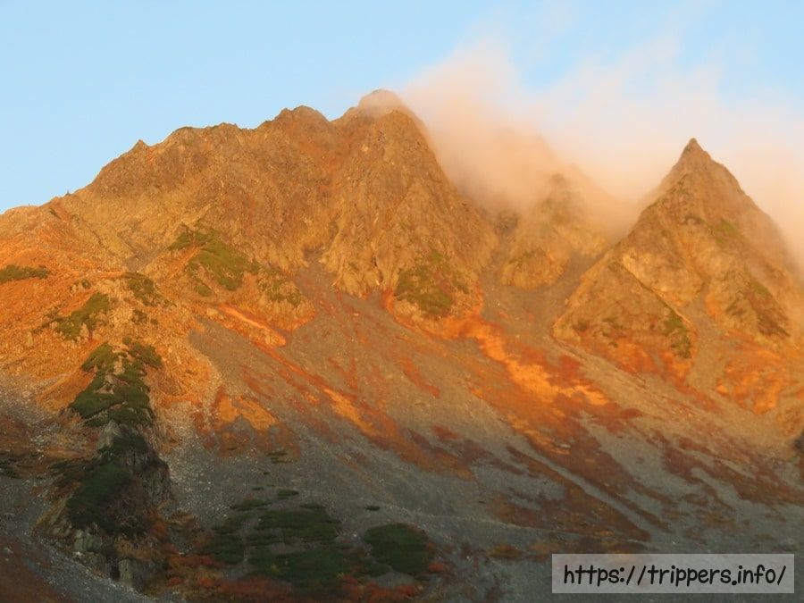 涸沢岳が綺麗に染まっています。涸沢カールの代名詞でもあるモルゲンロートが終わる頃にはガスが発生したりガスが消えたりを繰り返していました。十分に景色を堪能した後はテントを折り畳み撤収します。