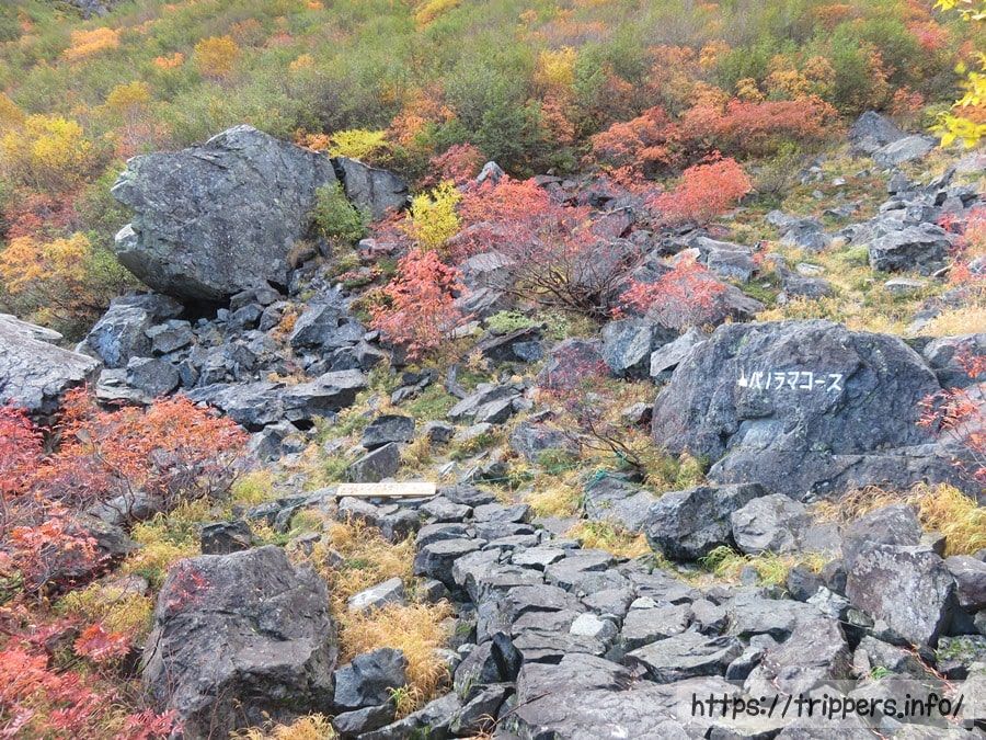 パノラマコースはトラバース(斜面を横断)コースとなっていました。足を踏み外したら滑落します。登山道は細く、すれ違う事が難しいですがパノラマコースの終わりまでにすれ違ったのは20人位でしょうか。それ程マイナールートでした。