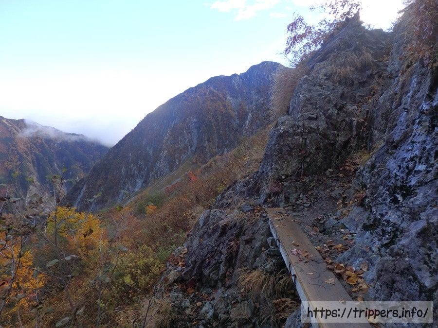背負っているリュックが太りすぎてすぐ脇の岩壁にぶつかり体を崖へ押しやろうとしていました。こんなにリュックが憎らしいと感じる事はトラバースでしかないのですが、その中でも1番憎かったです。