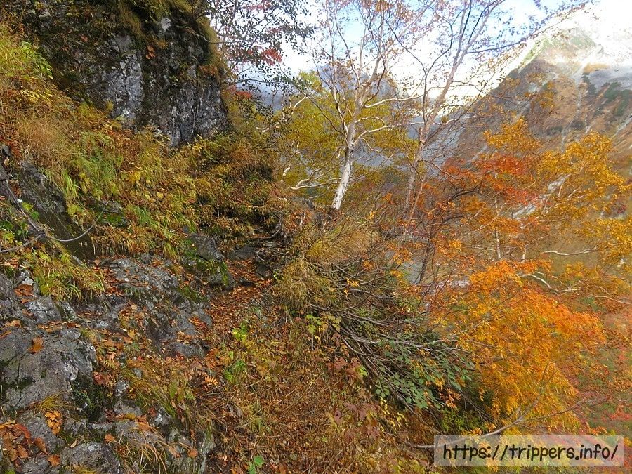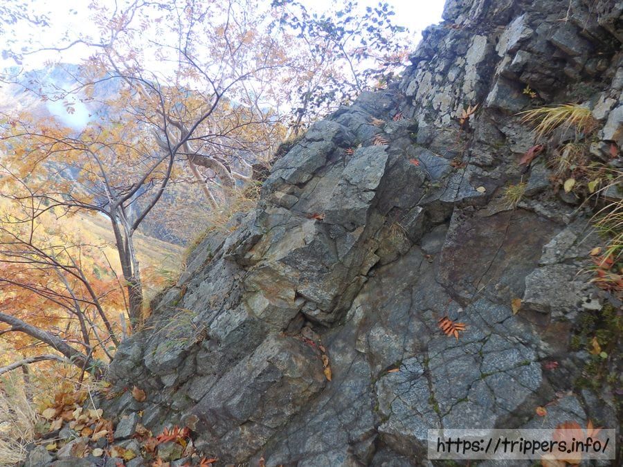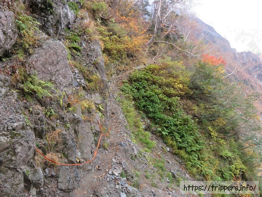トラバースはずっと続き、狭い道も落ち葉で隠れ、滑りやすくなっています。鎖や紐が補助として取り付けられていますが、個人的には岩を掴んだ方が安心して通過できました。