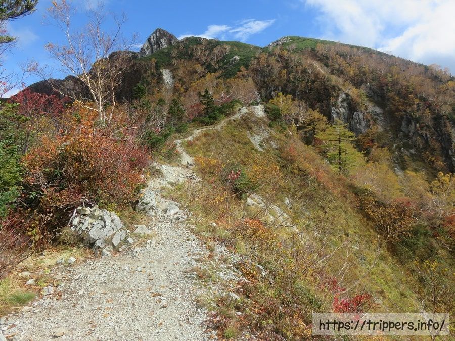 恐怖の時間(他の人からしたら緊張の時間?)を過ごした後はルンゼ(岩溝)を通過し、暫く進むと尾根に到着します。台風接近の影響か強風が吹き付けています。