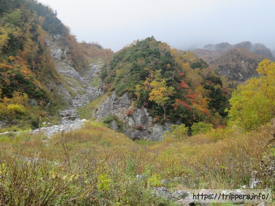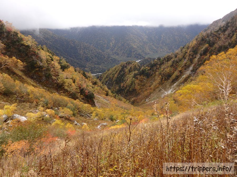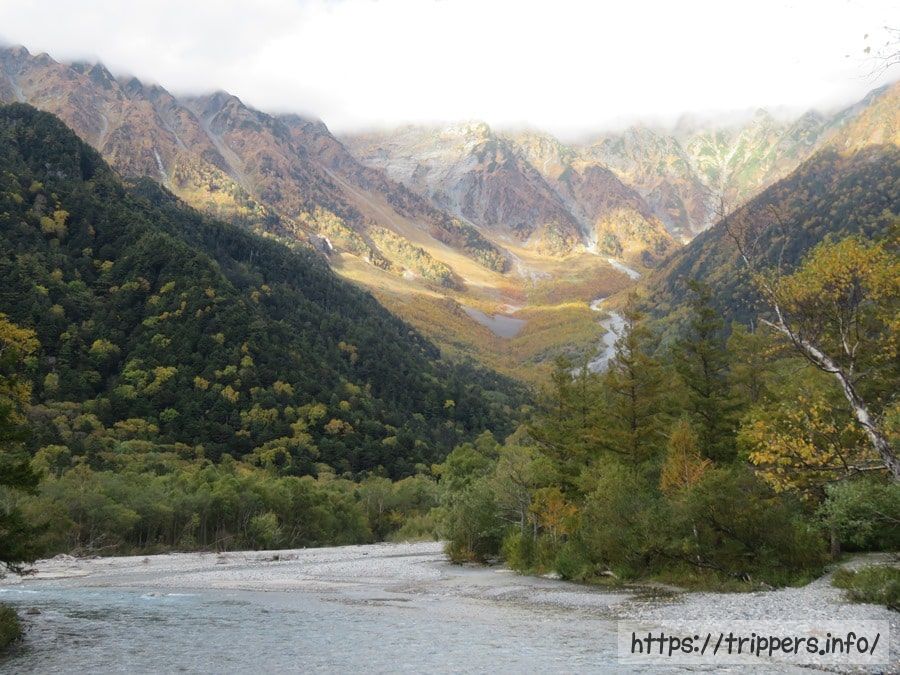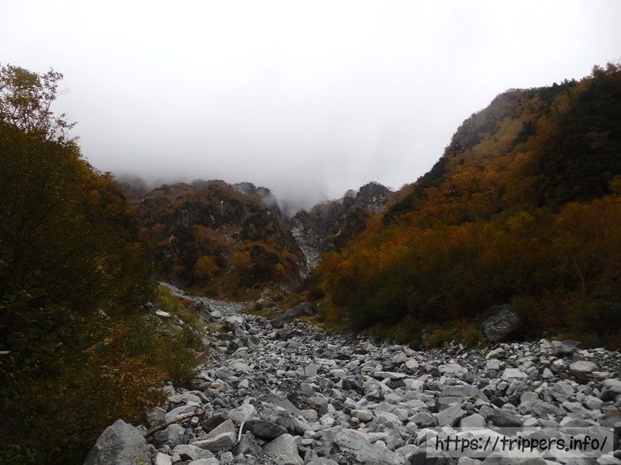 奥又白谷河原にお昼前に到着しました。随分時間に遅れていますが、その可能性を考えて上高地発のバスは16:15なので時間に追われる必要はなさそうです。小雨が降ったりやんだりの繰り返しで雨合羽を着ようか迷います。