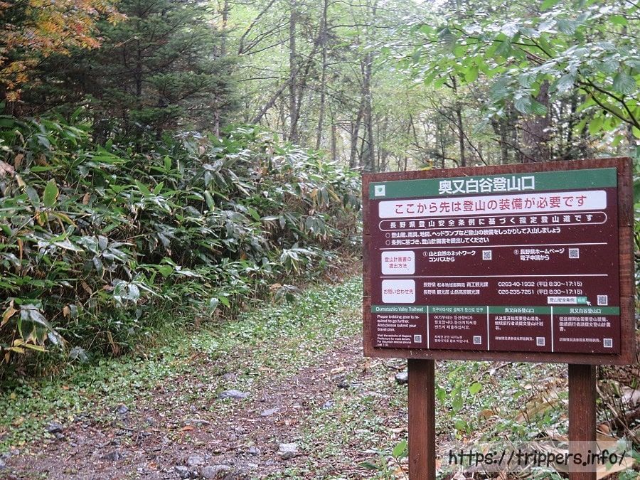 奥又白谷登山口に到着。ここから右へ車道を歩きます。左へ行っても上高地へは帰れません。道標がないので間違えないように注意です。