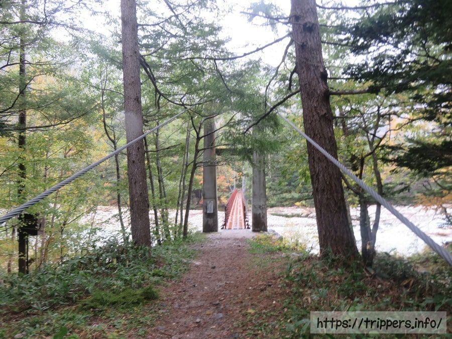 見えてきた新村橋を渡れば、行きに通った徳沢と横尾の間のルートに合流します。ここからは槍ヶ岳や涸沢カールから下山して来た人やこれから横尾に宿泊する人とすれ違い、抜きつ抜かれつつ歩きます。