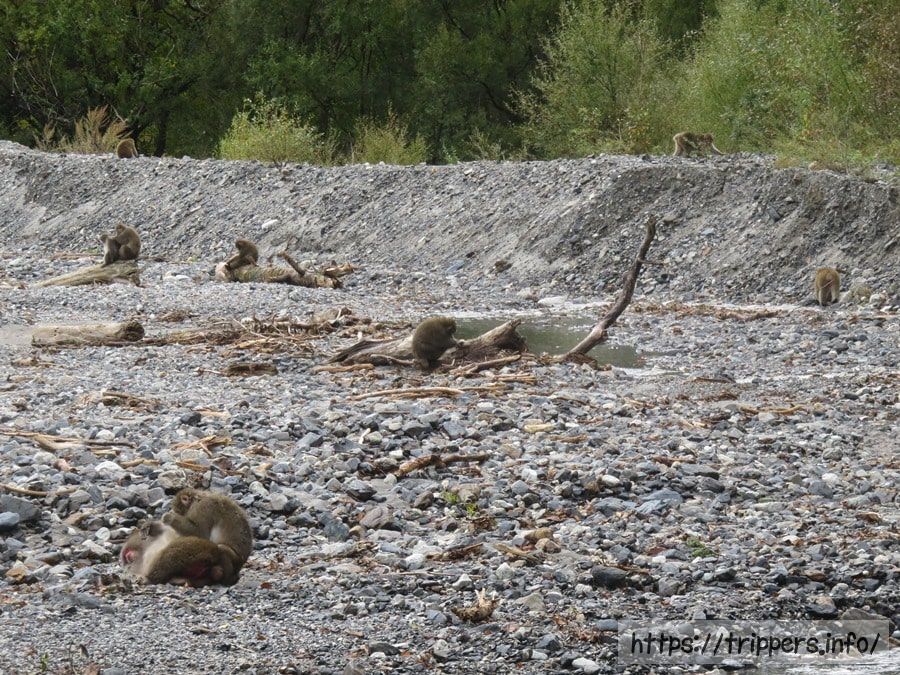 何匹の猿を見つけられるでしょうか?子連れの猿は近寄ることなかれです。少なくともこの画面の中に9匹はいますね。