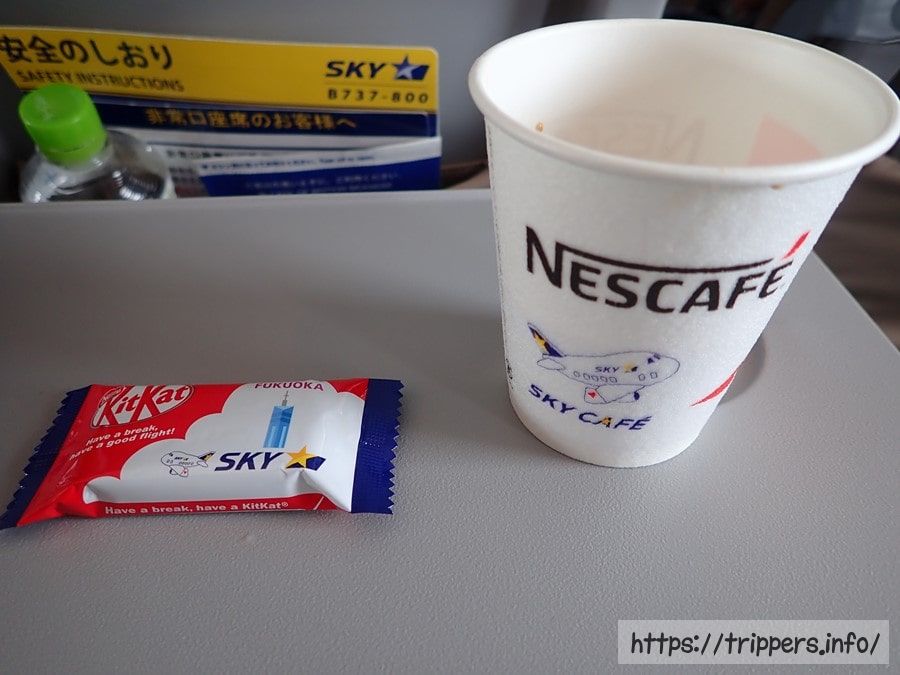 スカイマークとネスレがパートナー契約を締結したことによって、コーヒーとキットカットの提供がありました。食事提供のない国内線では嬉しい提供です。