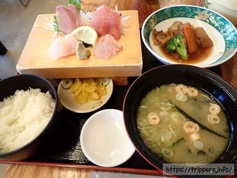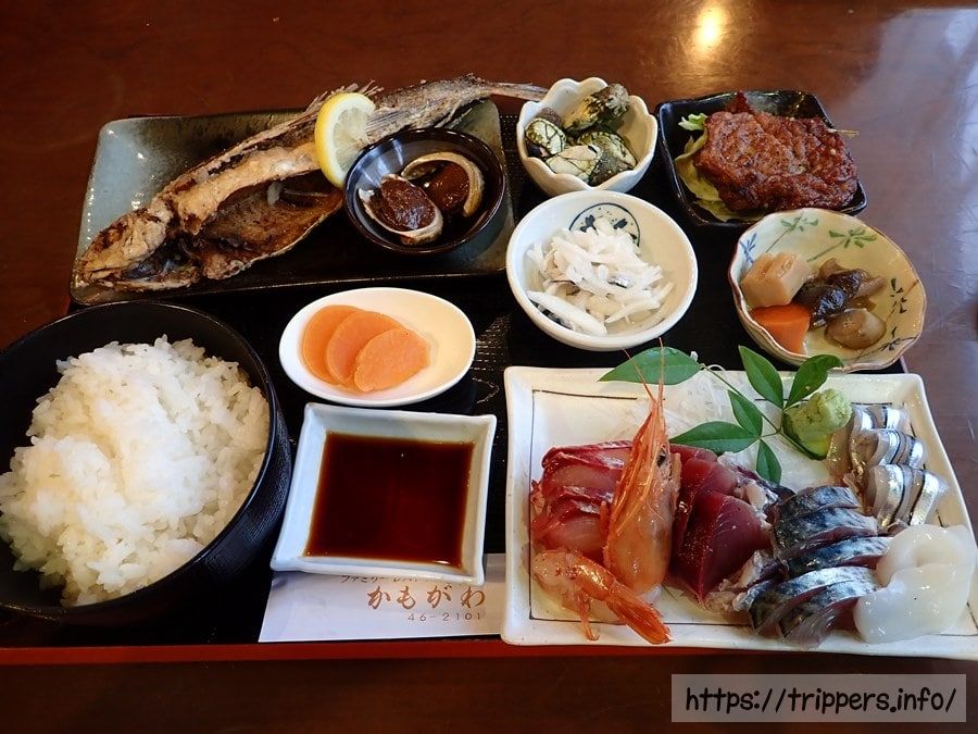 夕食は民宿でお勧めされた安くて美味しいかもがわレストランでトビウオのから揚げと刺身定食です。