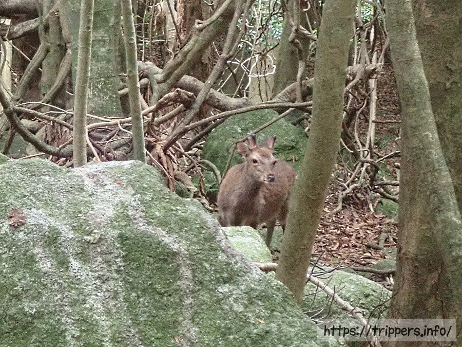 林道を歩いているとヤクシカに遭遇しました。子供かと思いきや、これで立派な大人のサイズです。本土のシカより小さいのが特徴です。