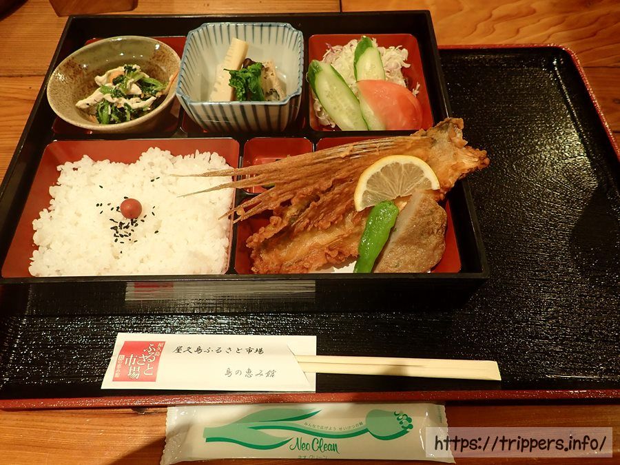 宮之浦地区まで来たらふるさと市場で昼食です。ここはツアー会社と同じ系列とのこと。トビウオ定食で、トビウオは1匹の半分のサイズでしたが、味は美味しいです。市販で売っているようなから揚げの調味料が使われており、トビウオの美味しくない淡泊さが抑えられていました。