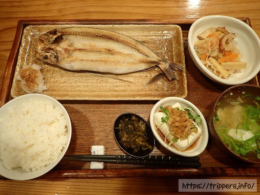 夕食は宿の目の前にあった小花でトビウオの焼き魚定食を注文しました。トビウオは今まで揚げたものしか食べてなかったので、焼きも食べてみようと思いました。