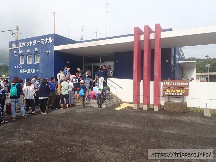 今日は船と飛行機で屋久島から東京の羽田へ帰る日です。高速船トッピー乗り場は営業時間前から人が並んでいます。一昨日から船が欠航していたので、今日乗るために振替客が多そうです。ただ午前の便は前日には全て満席でした。