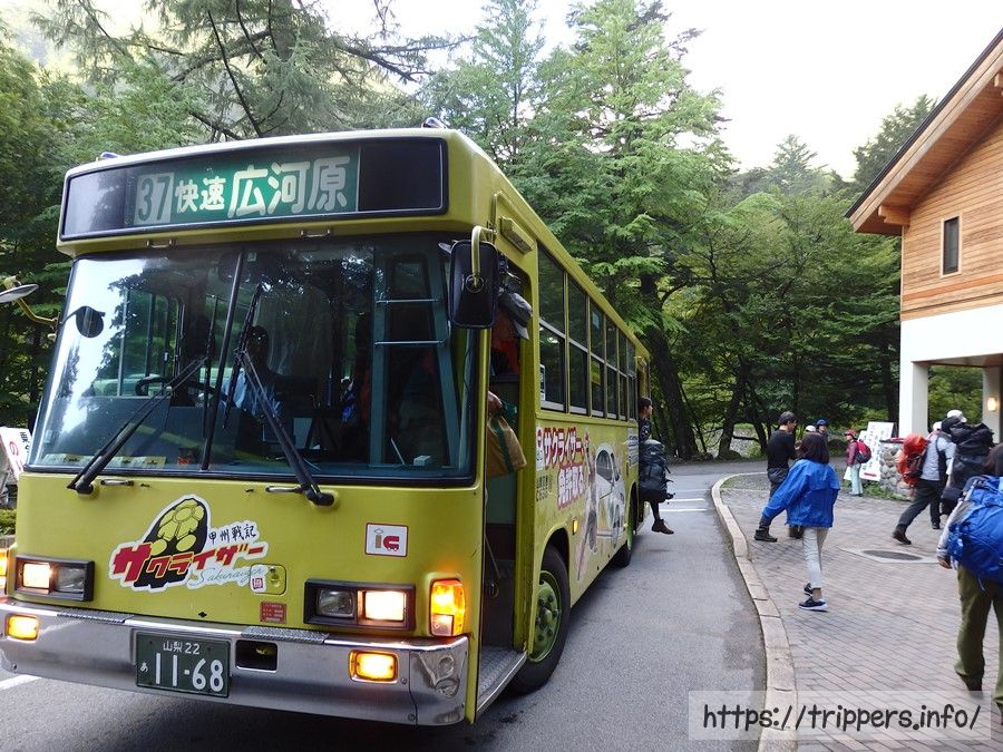 登山口である広河原へのバスの始発は日の出前の4:35です。一昔前はバス停がある甲府駅の廊下とかでバスが来るまで野宿していた登山者が結構いたようですが、調べてみると最近はいないようです。