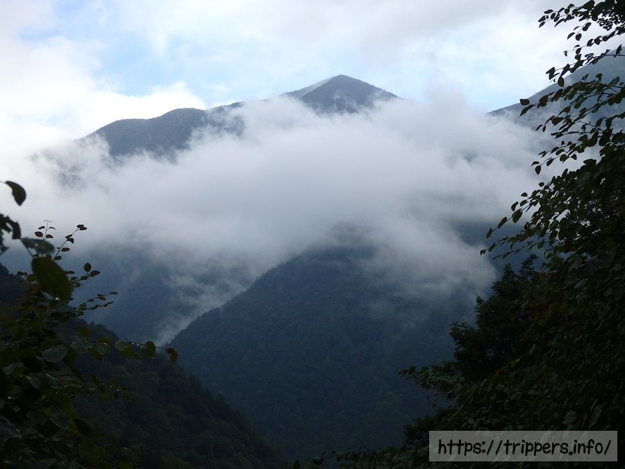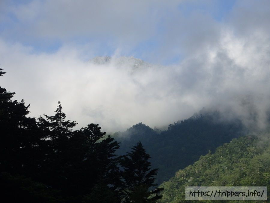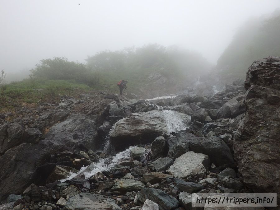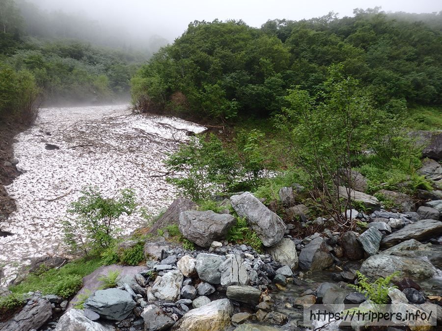 時々、木々の向こうに発生しているガスが雪渓に見えて、大樺沢二俣にもう到着!って思いながら、大樺沢二俣はまだまだ先でした。