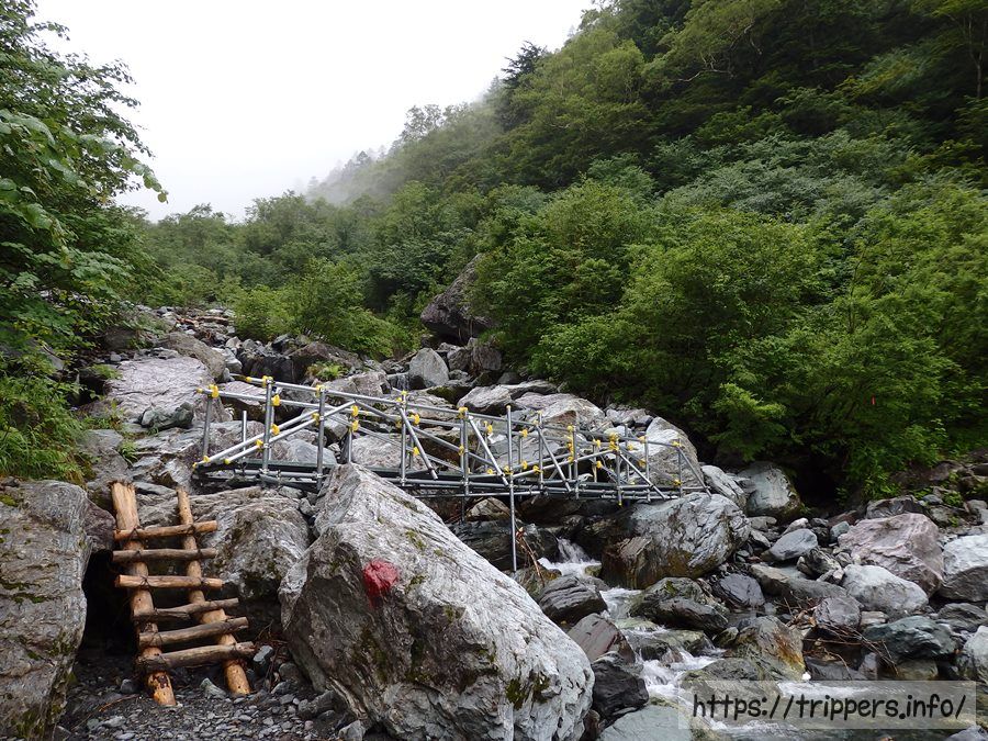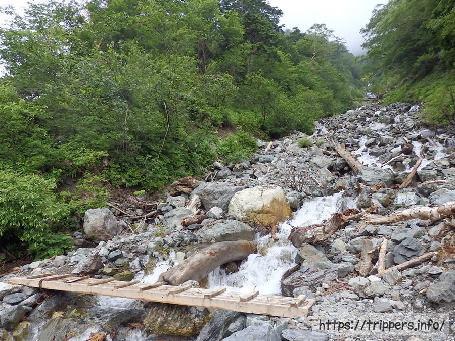 行きは沢の横を通過する大樺沢ルートですが、大雨が降ったら増水して怖いです。