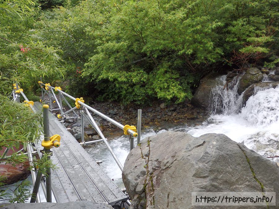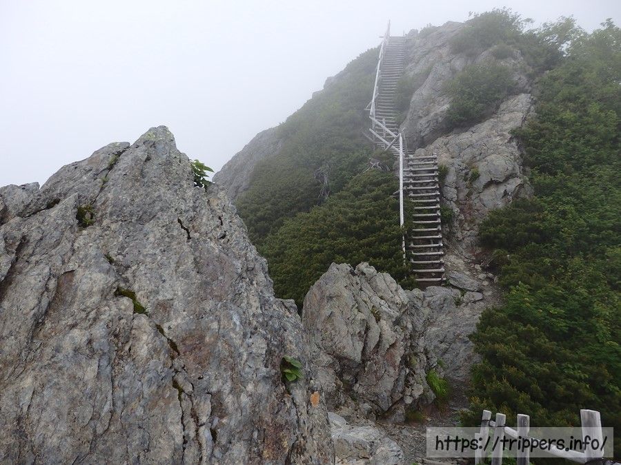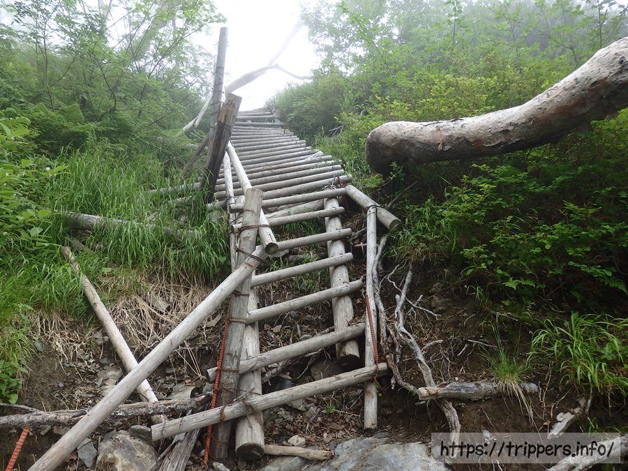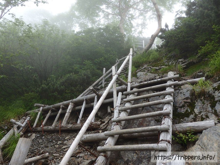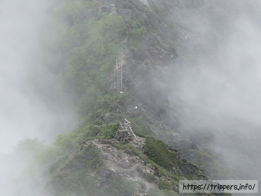 雪渓が終わると今度は急登の梯子が連続で出現します。ちょっと梯子の角度が変な事になっていますが、危険性はありませんでした。