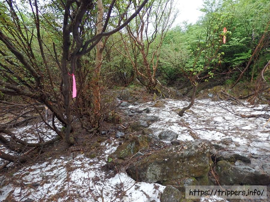一人だけの意見に左右されるのは危険なので、後から雪渓を降りてきた男性に質問すると、踏み跡があるので迷う場所はないようです。また雪渓歩きは少しだけで済むようです。