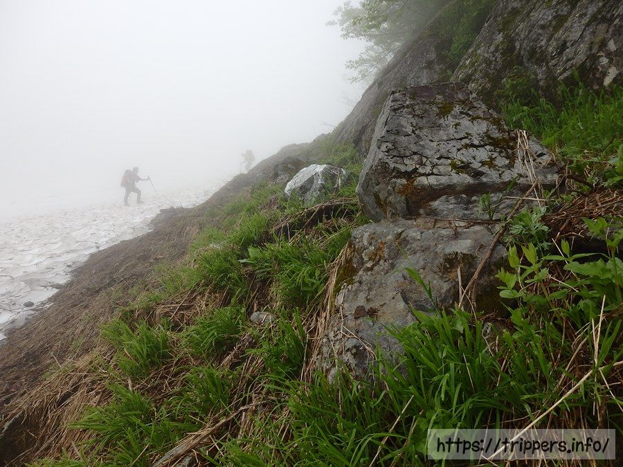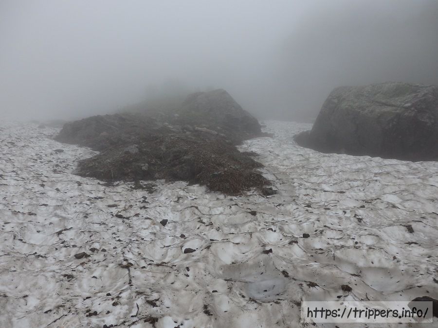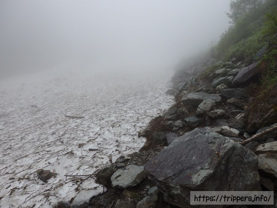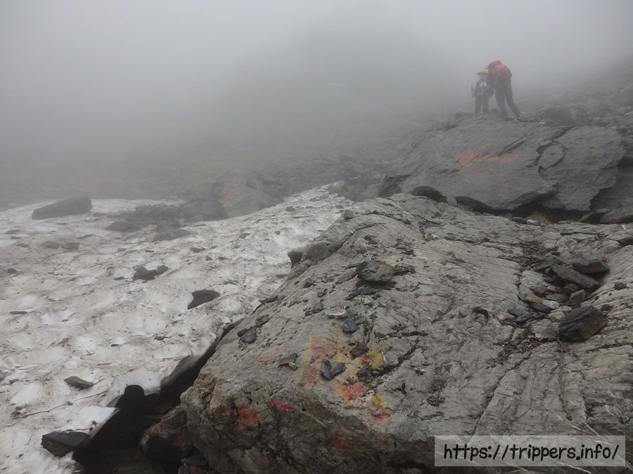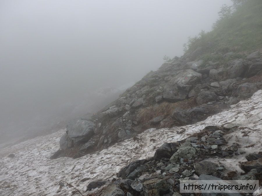 これから登る男性グループは雪渓を通らないルートを選択したようです。しかし何組か雪渓を通って降りてきた人がいたので、雪渓を通って行こうと思います。視界が悪いので雪渓上の落石の音には注意です。