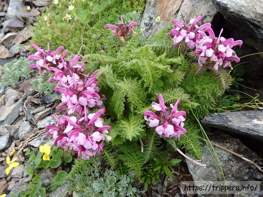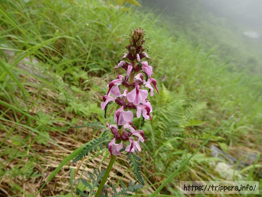 ヨツバシオガマを発見。よく見てみると花の形が鳥の頭部に似ています。ハクサンチドリの鳥の頭部みたいな形をした花とどっちが好みだろう?私はヨツバシオガマかな。