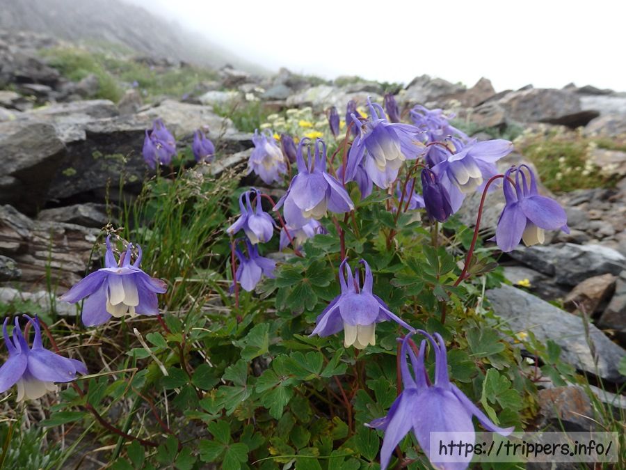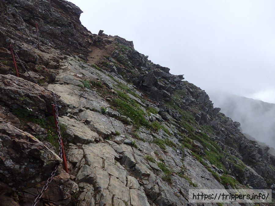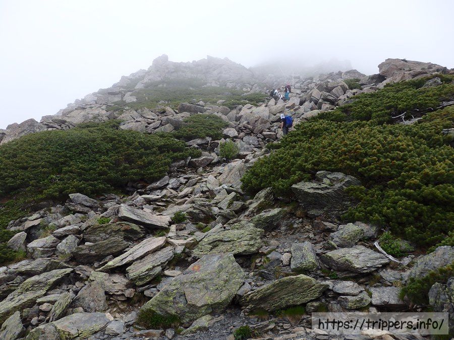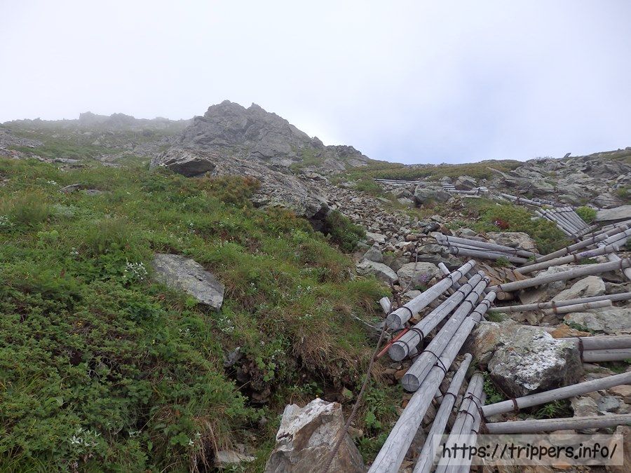 一部雪渓になっている場所で熟年夫婦に出会いました。今日登り始めたけれど、天気が悪いので下山するそうです。嗚呼、やっぱり下山したくなるほど今回展望を期待できないよね。前泊までしたし... 命の危険はなさそうなので登ります。(翌朝少しだけ景色が見れました。)